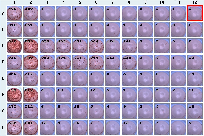 其中,ELISPOT检测效果如图4,其中红色斑点由特异性肽表位体外刺激后的特异性T细胞分泌至周边的IFN-γ聚集形成,其数目表示疫苗免疫激发获得的特异性T细胞频数。
